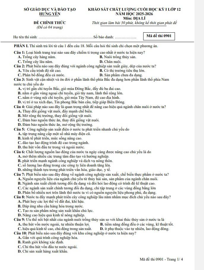Đề thi cuối học kì 1 địa lí lớp 12 Hưng Yên 2026 mã đề 0910 có đáp án. Gần giáp tết năm 2026, sở GD & ĐT tỉnh Hưng Yên tổ chức thi khảo sát chất lượng cuối học kì 1 lớp 12 cho toàn bộ học sinh trên địa bàn. Đề năm nay có rất nhiều câu hỏi hay, các em hãy tham khảo nhé.