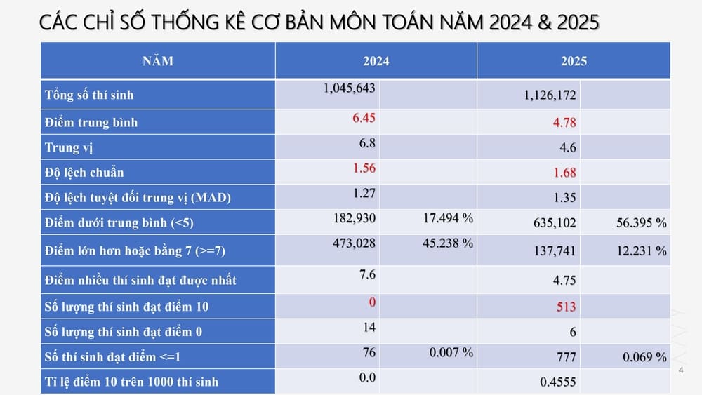 Dựa vào các chỉ số thống kê về môn toán trong kỳ thi thpt quốc gia 2025 các bạn có thể thấy điểm trung bình môn toán giảm gần 2 điểm và có 635,102 thí sinh có điểm môn toán dưới 5. Các con số thống kê cho thấy môn toán năm nay đã làm khó học sinh như thế nào hoặc cũng có thể học sinh chưa bắt kịp dạng toán thực tế so với kiến thức đã học trên lớp. Đề các năm tới sẽ vẫn giữ nguyên ổn định cấu trúc như hiện tại do vậy các em hãy ôn tập để chuẩn bị tốt kiến thức cho mình nhé.